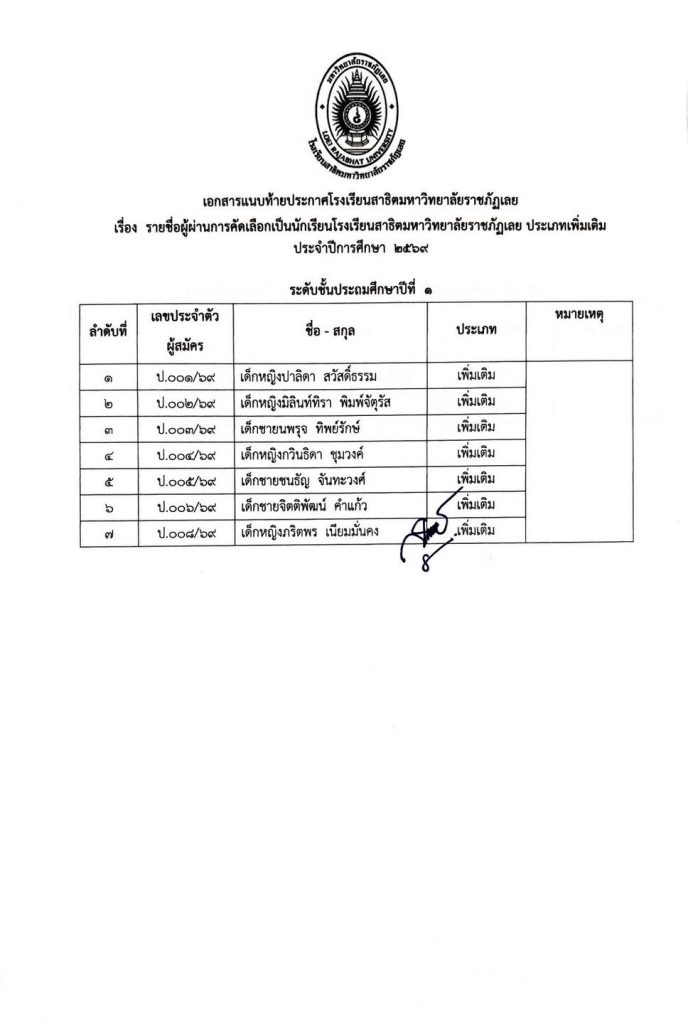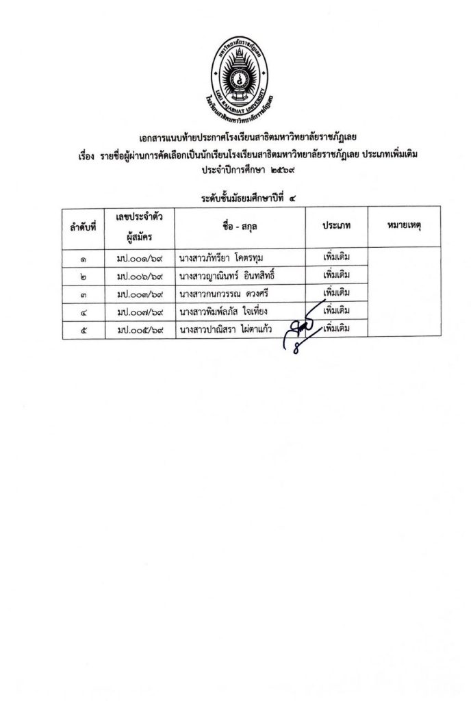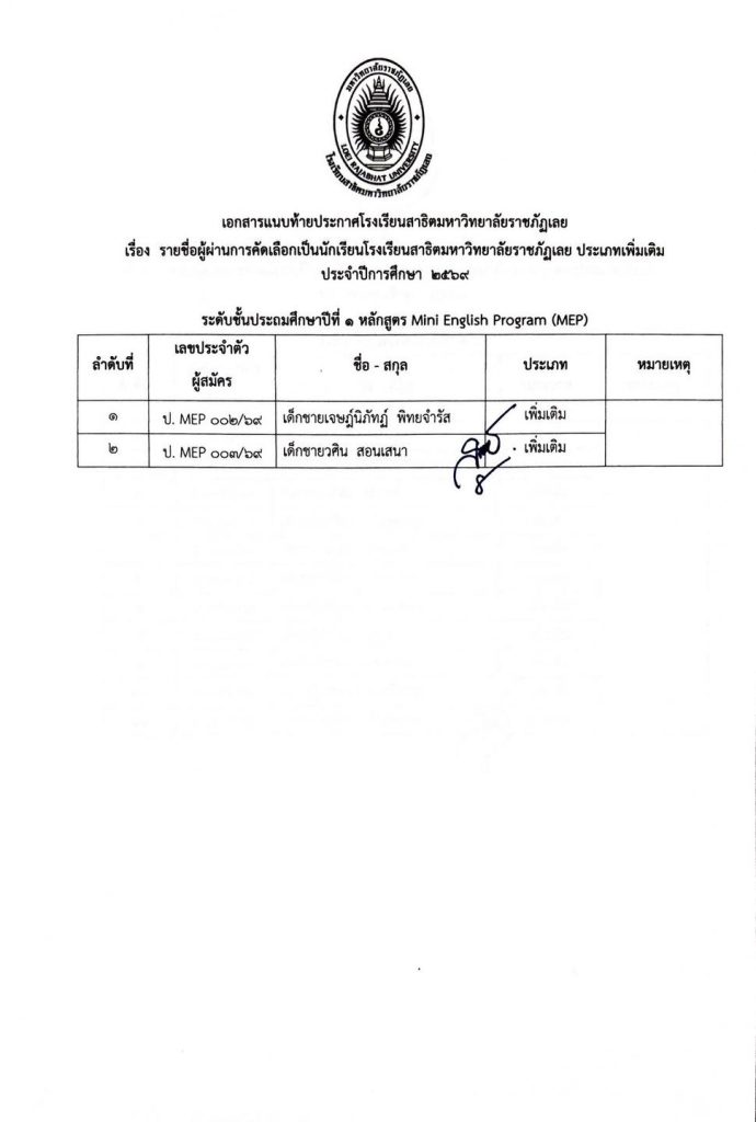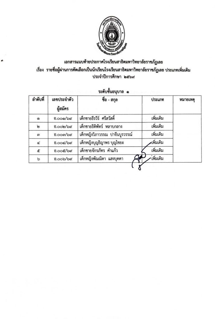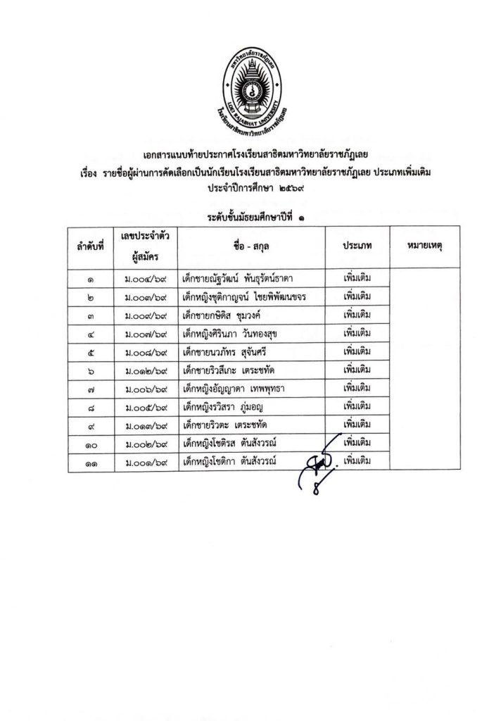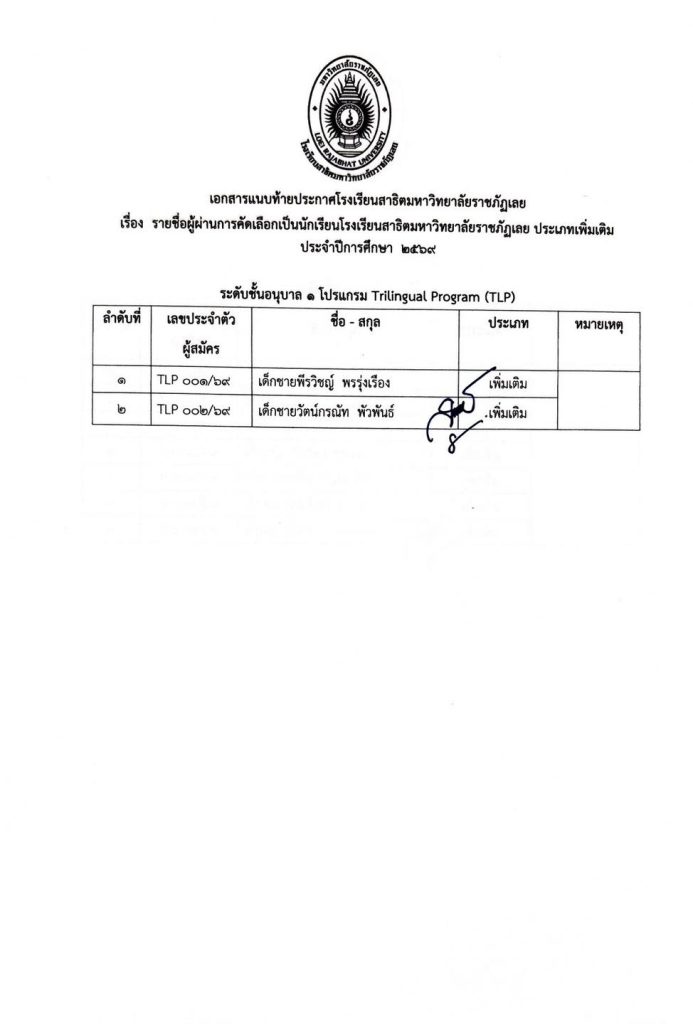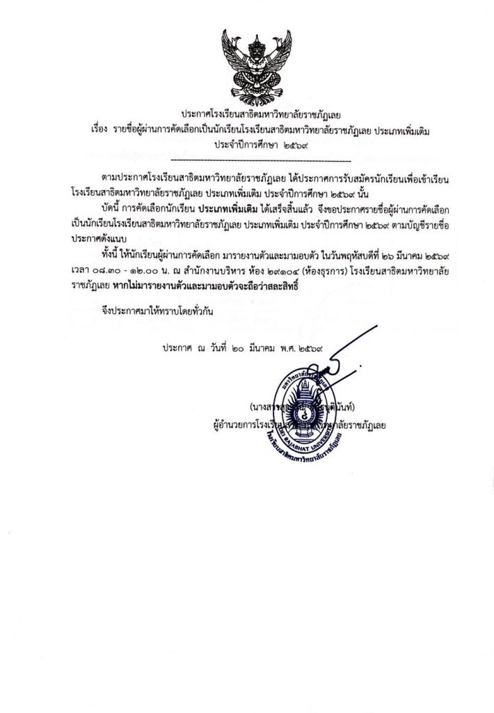 ไม่มีหมวดหมู่ ประกาศรายชื่อผู้ผ่านการคัดเลือกเป็นนักเรียนโรงเรียนสาธิตมหาวิทยาลัยราชภัฏเลย ประเภทเพิ่มเติม การรายงานตัวและการมอบตัว ประจำปีการศึกษา 2569 20/03/2026 teerayut thairat