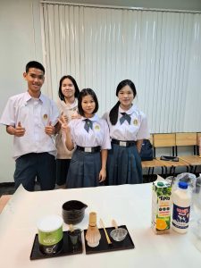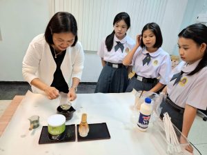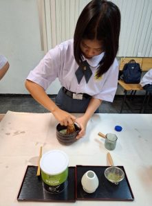 นักเรียนทุกคนได้ลงมือปฏิบัติจริง ตั้งแต่การร่อนผง การตีชาด้วยอุปกรณ์เฉพาะ (Chasen) ไปจนถึงการจัดแต่งแก้วและนำเสนอเมนูอย่างมืออาชีพ